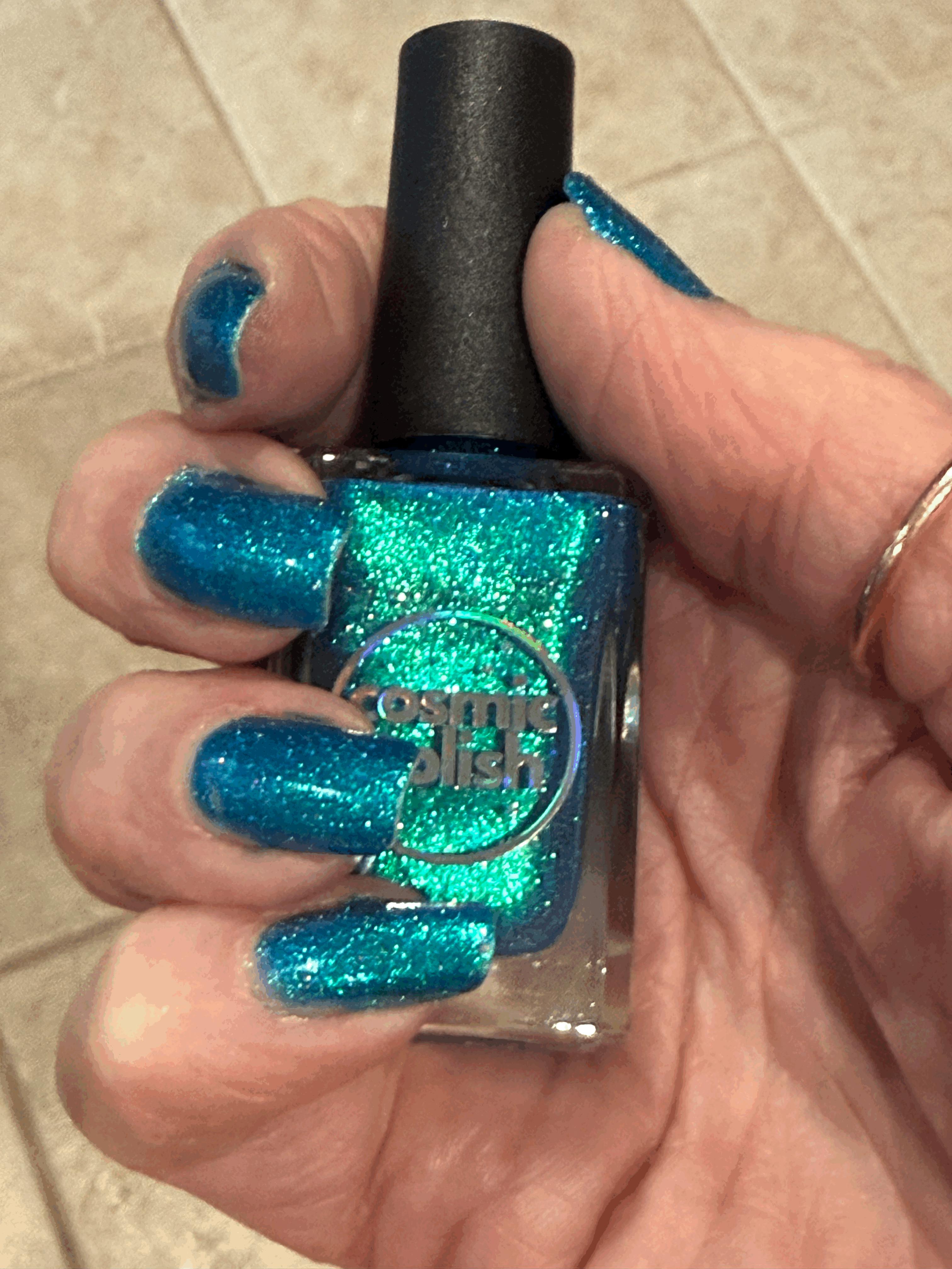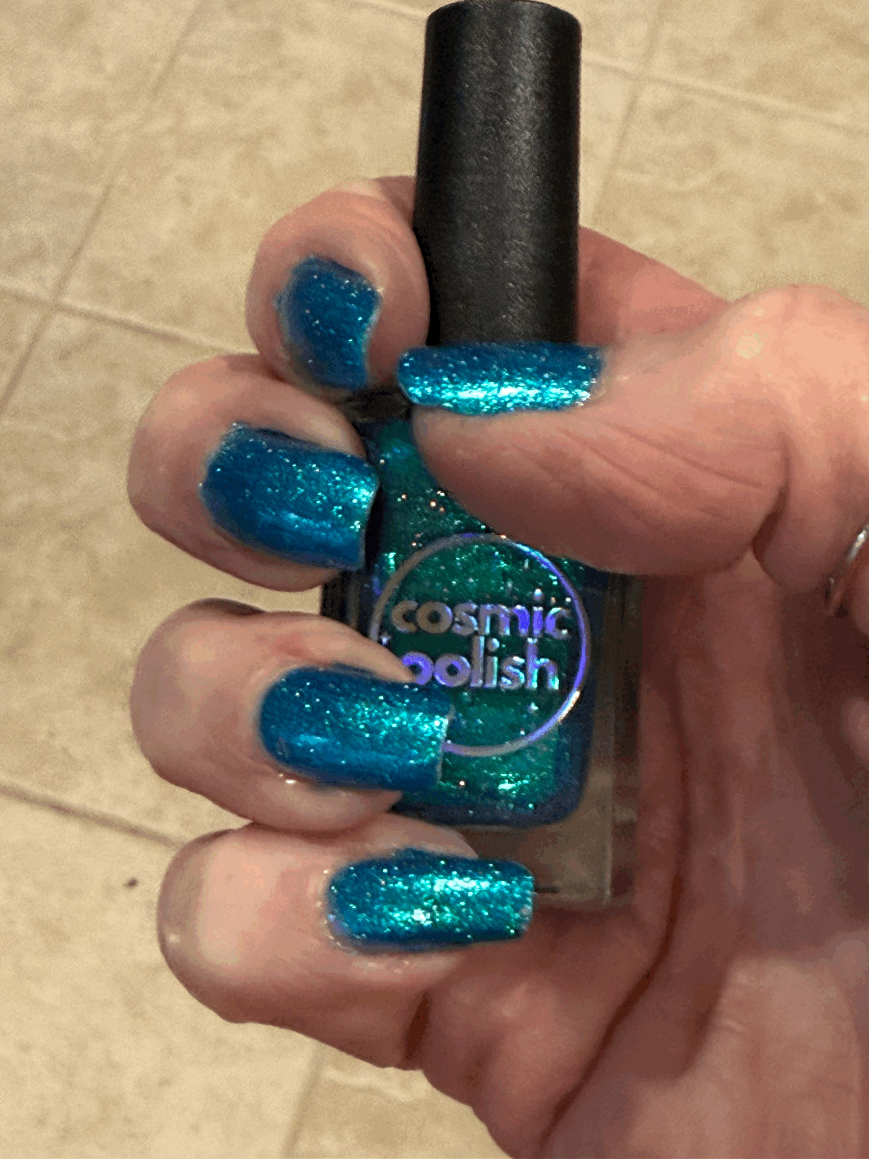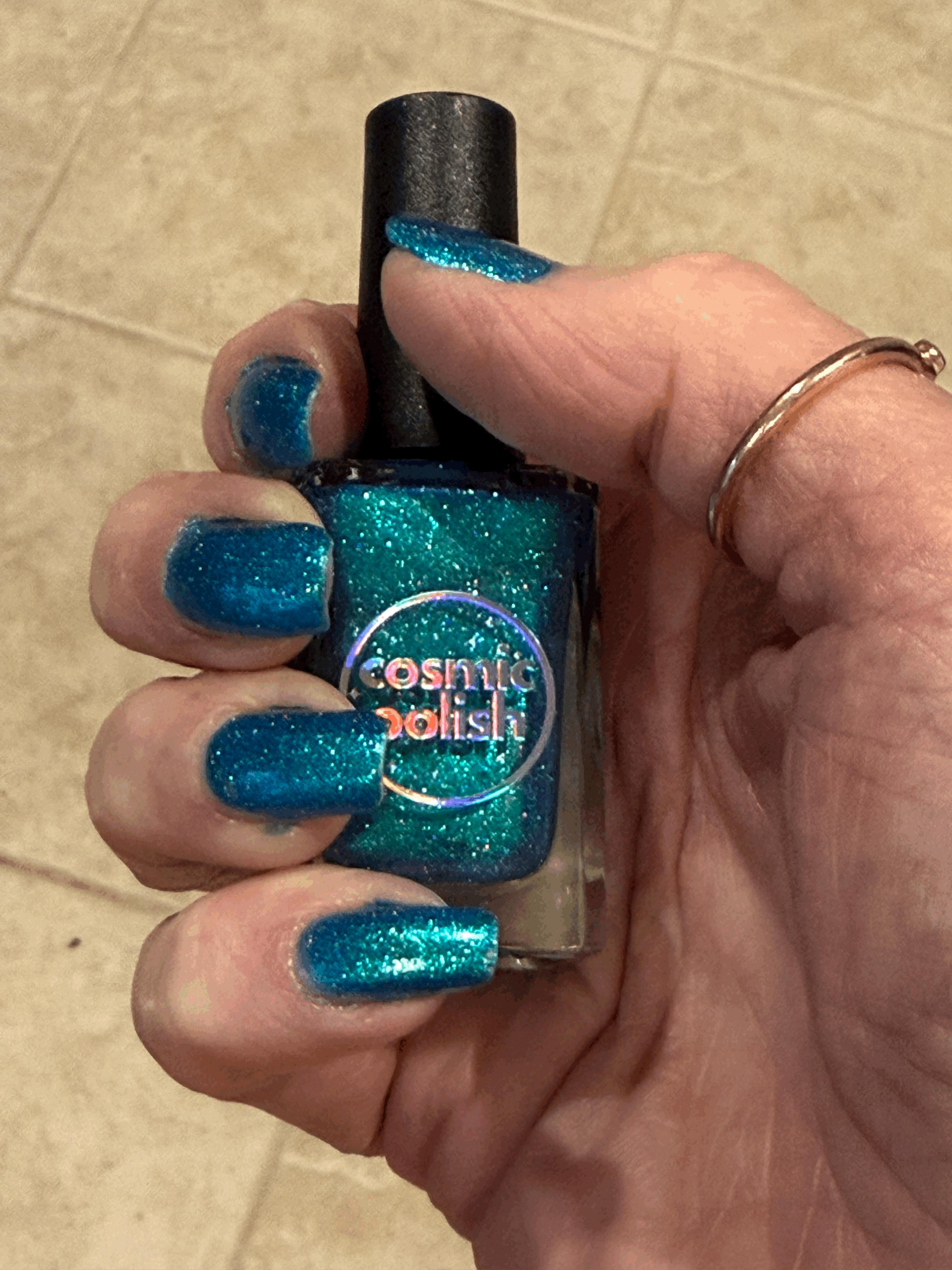 An absolutely stunning shimmering glowy sparkle of teal in this polish! It looks stunning on my nails and is totally unique to my collection. As always with Cosmic Polish, it's a perfect formula and very high quality. I received many compliments wearing Borealis or "Mermaid" as my friend said! Thank you Cosmic Polish!🩵💚💙