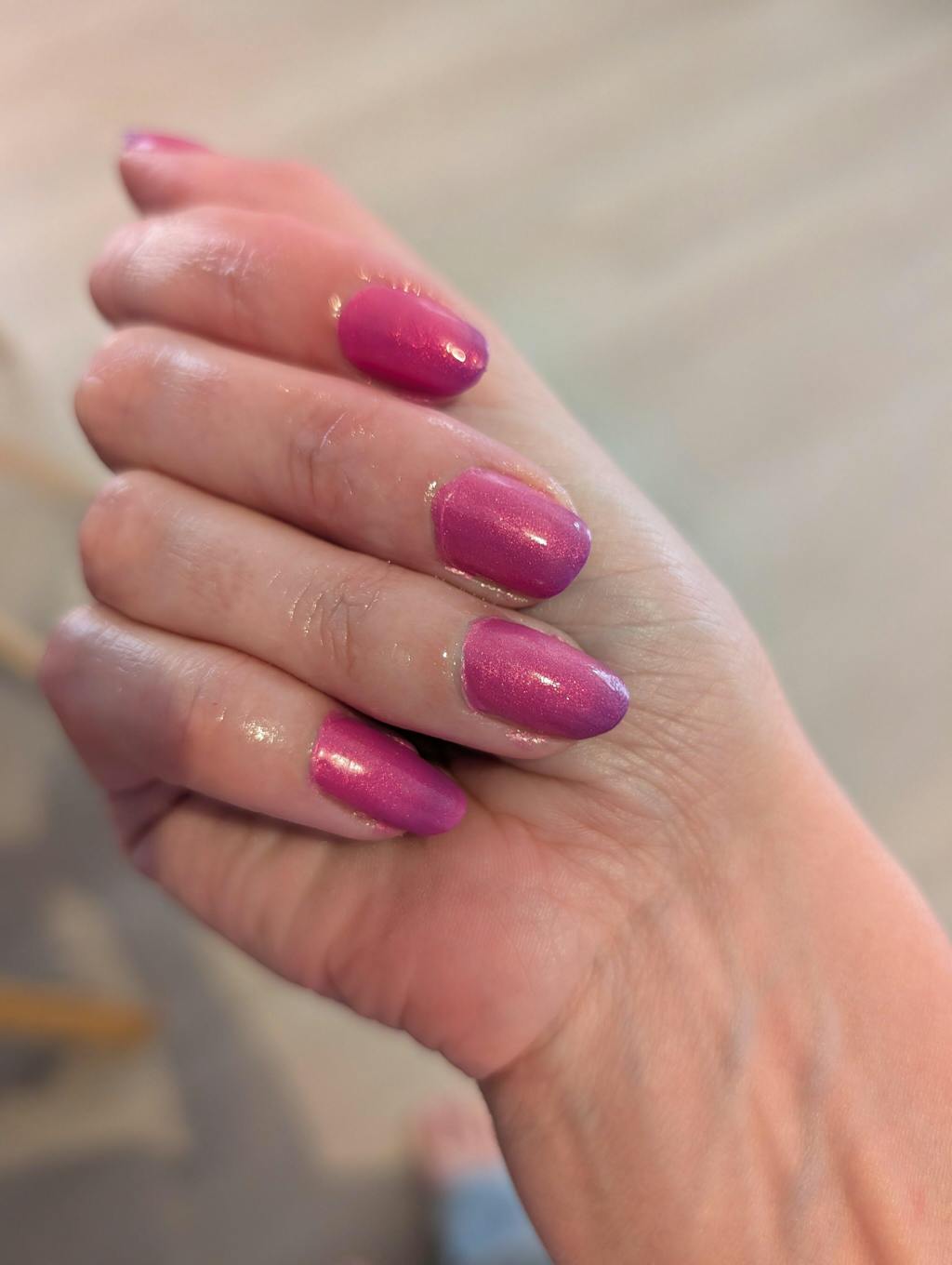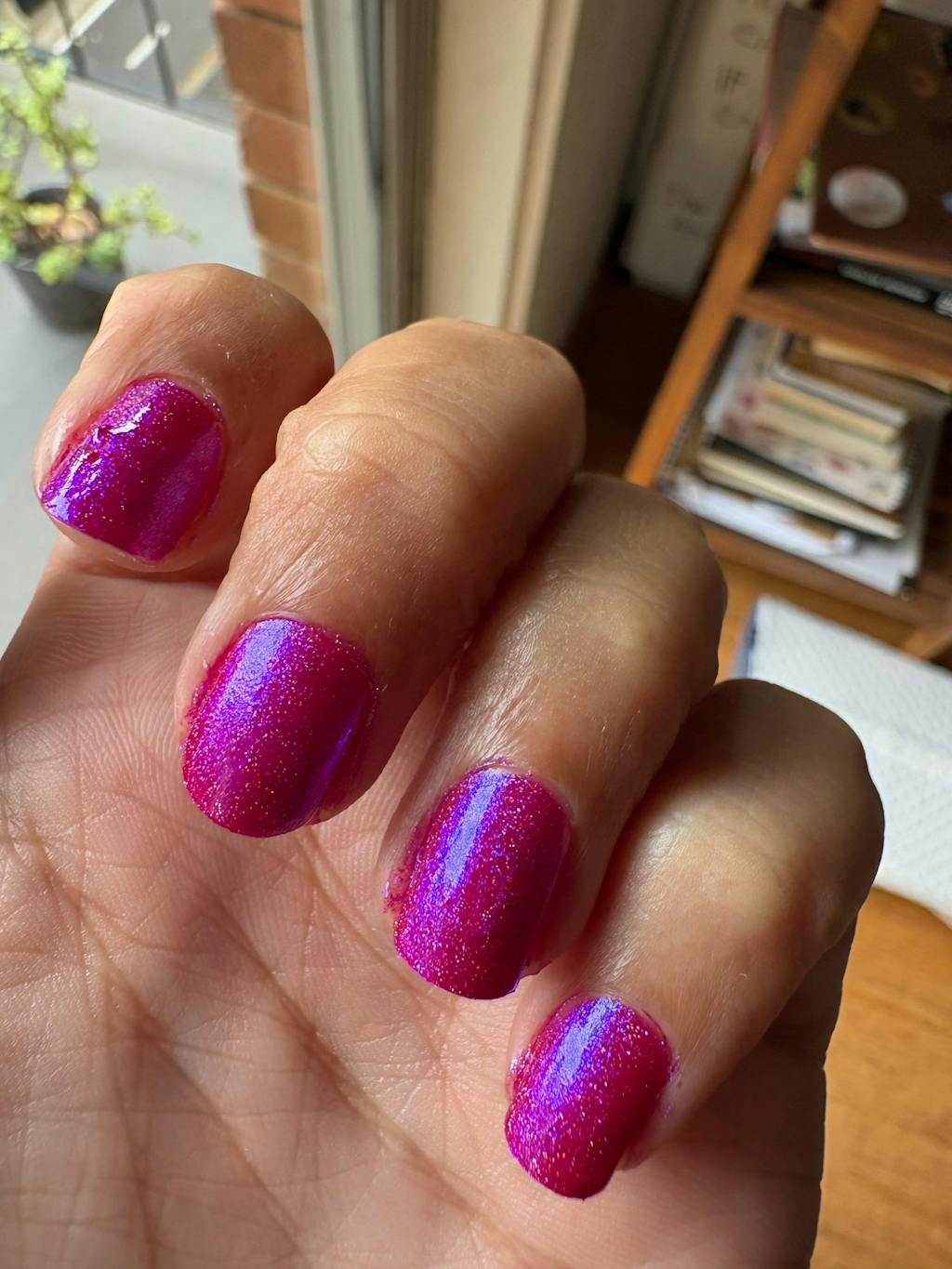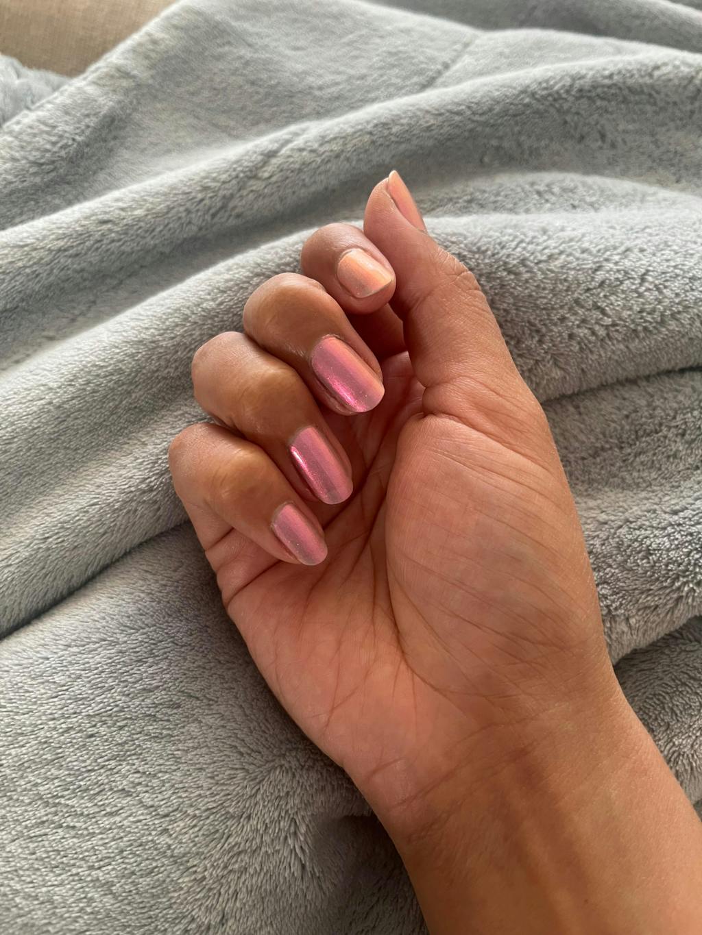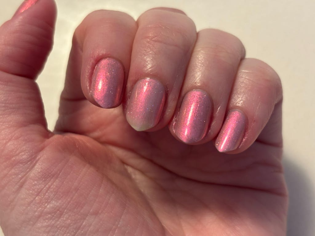 So pretty! Glowy, ethereal pink that shifts, on angles/in different light, to a slightly spooky cool-toned mauve with goth energy. In my photo, I have one coat on my middle finger and three (with Scattered Sunlight topper) on my other fingers.