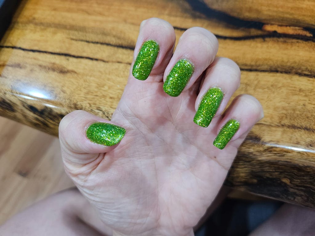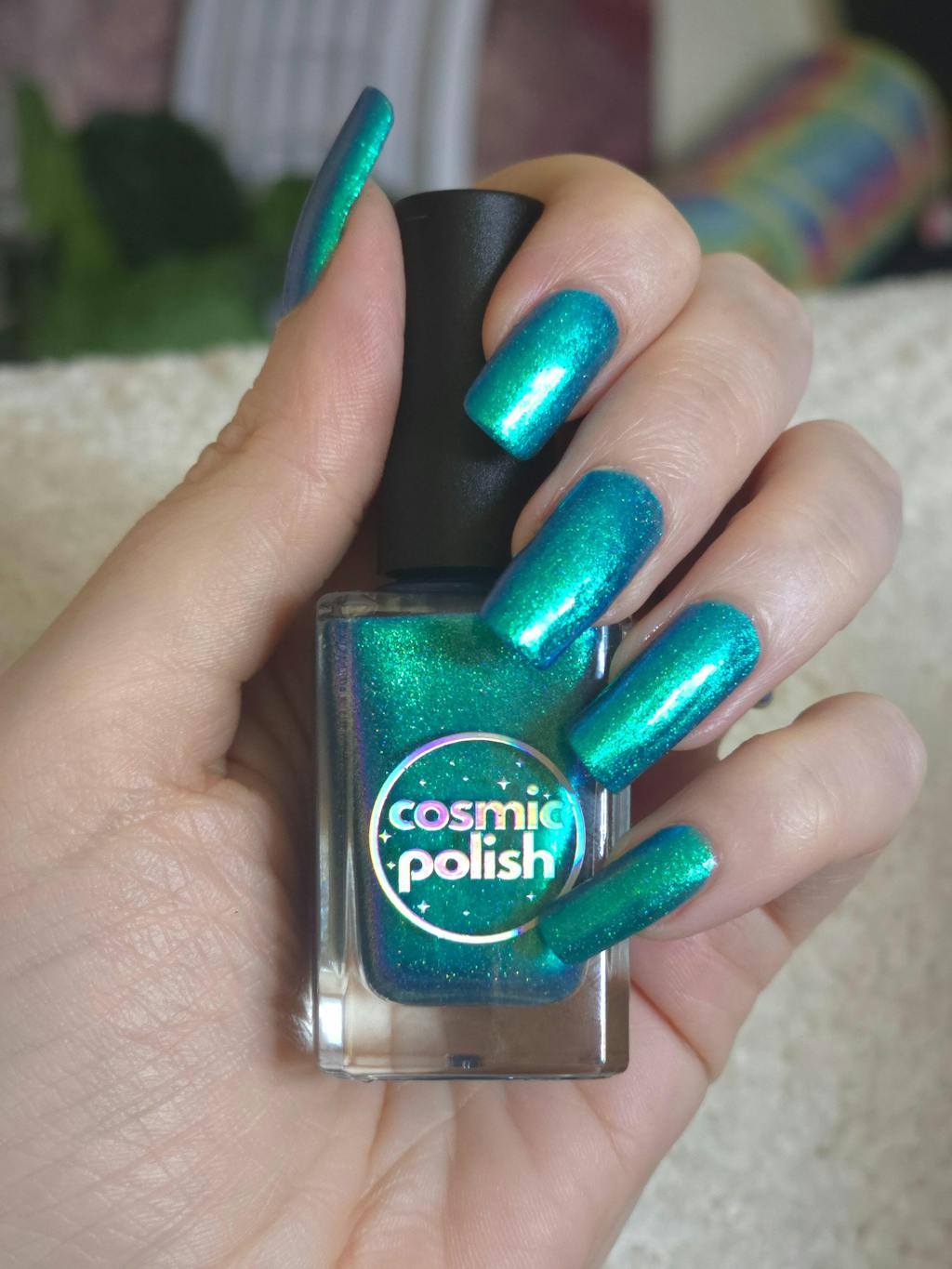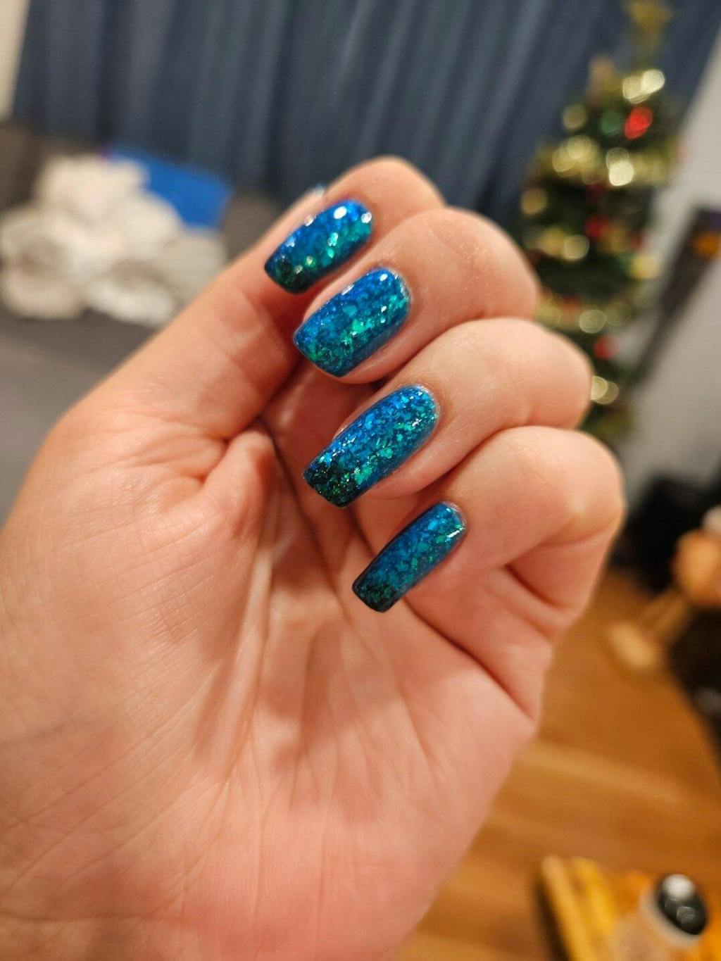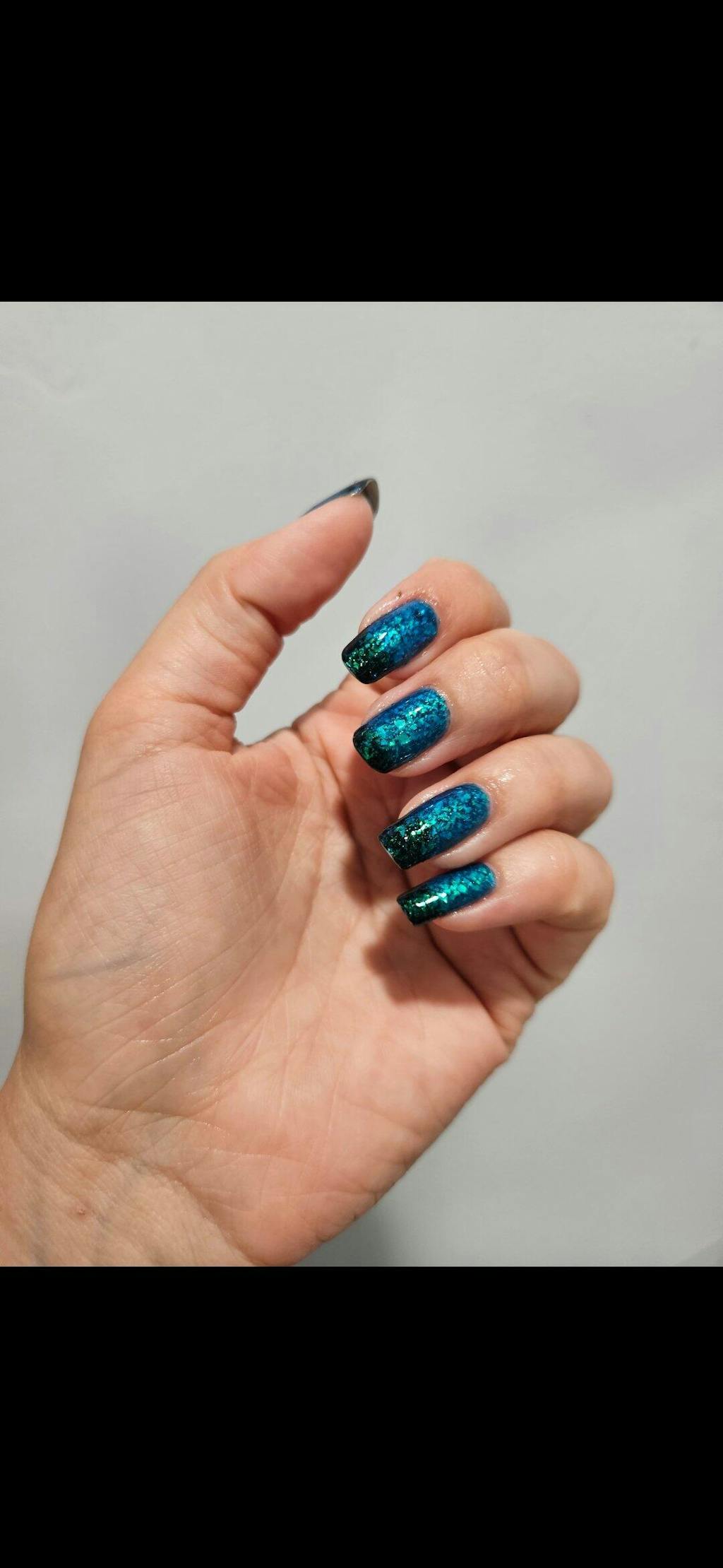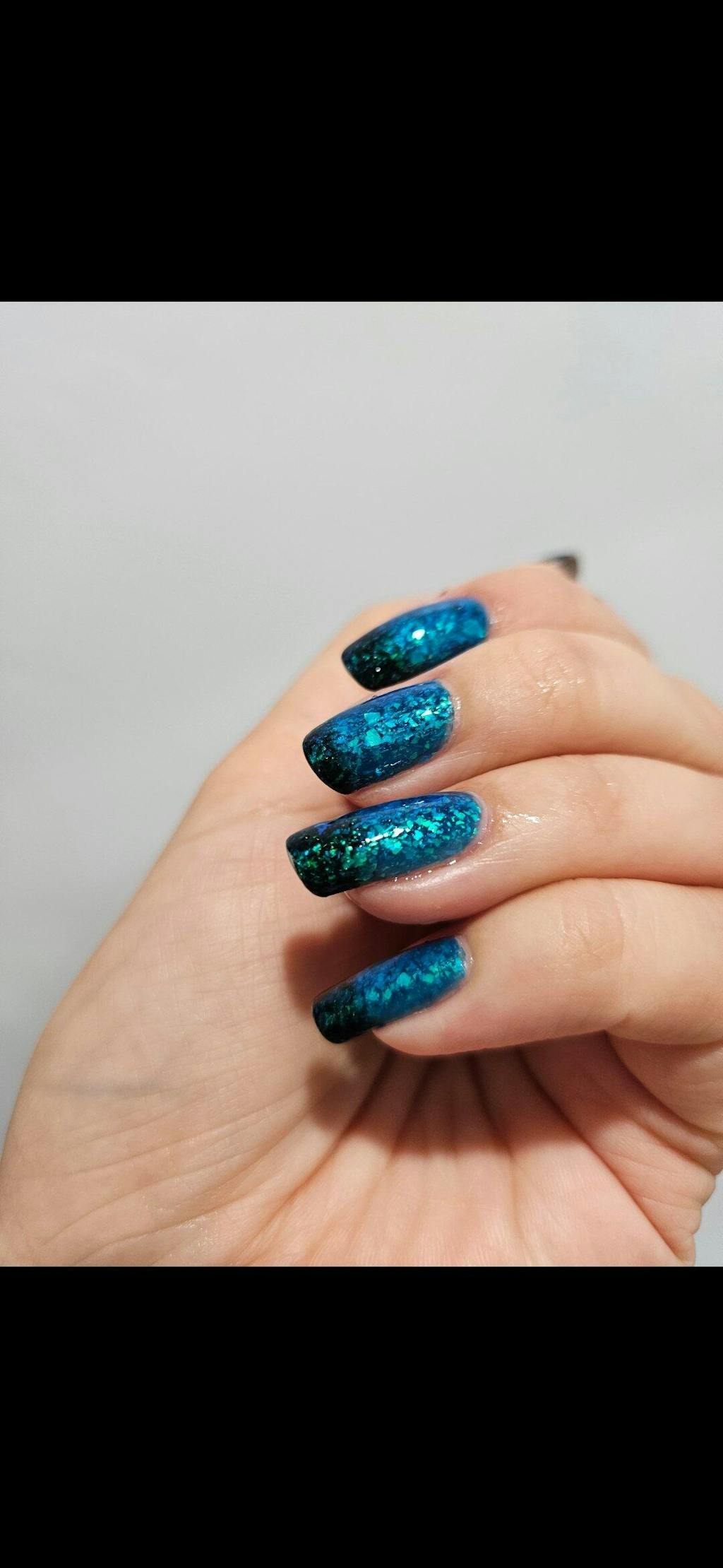I LOVE this polish. It's a mid blue in the sun and inky deep green when my fingers get cold. It changes throughout the day which is super fun. Lasts quite a while without chipping which I was so happy about. It gives mermaid vibes. It was my first order and they gave me a free polish which just happened to be the one I wanted and is also beautiful. And the packaging is so pretty I didn't want to throw it out!