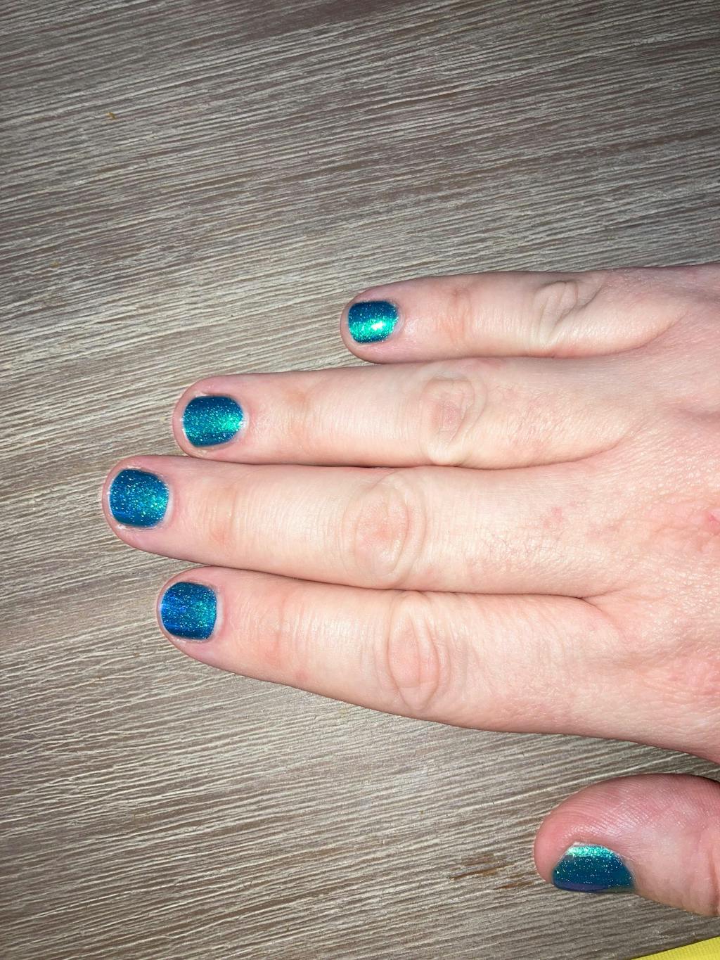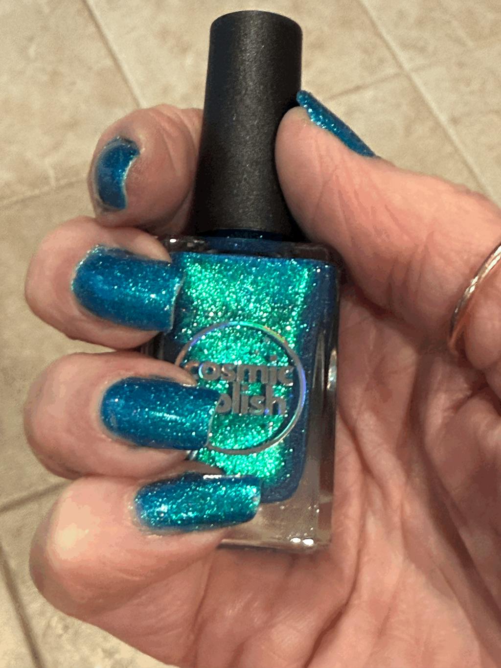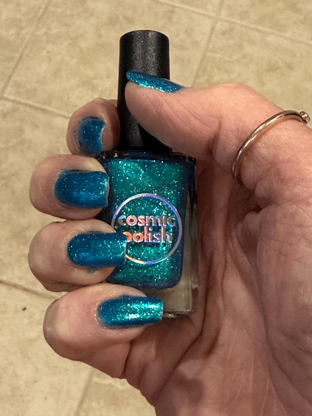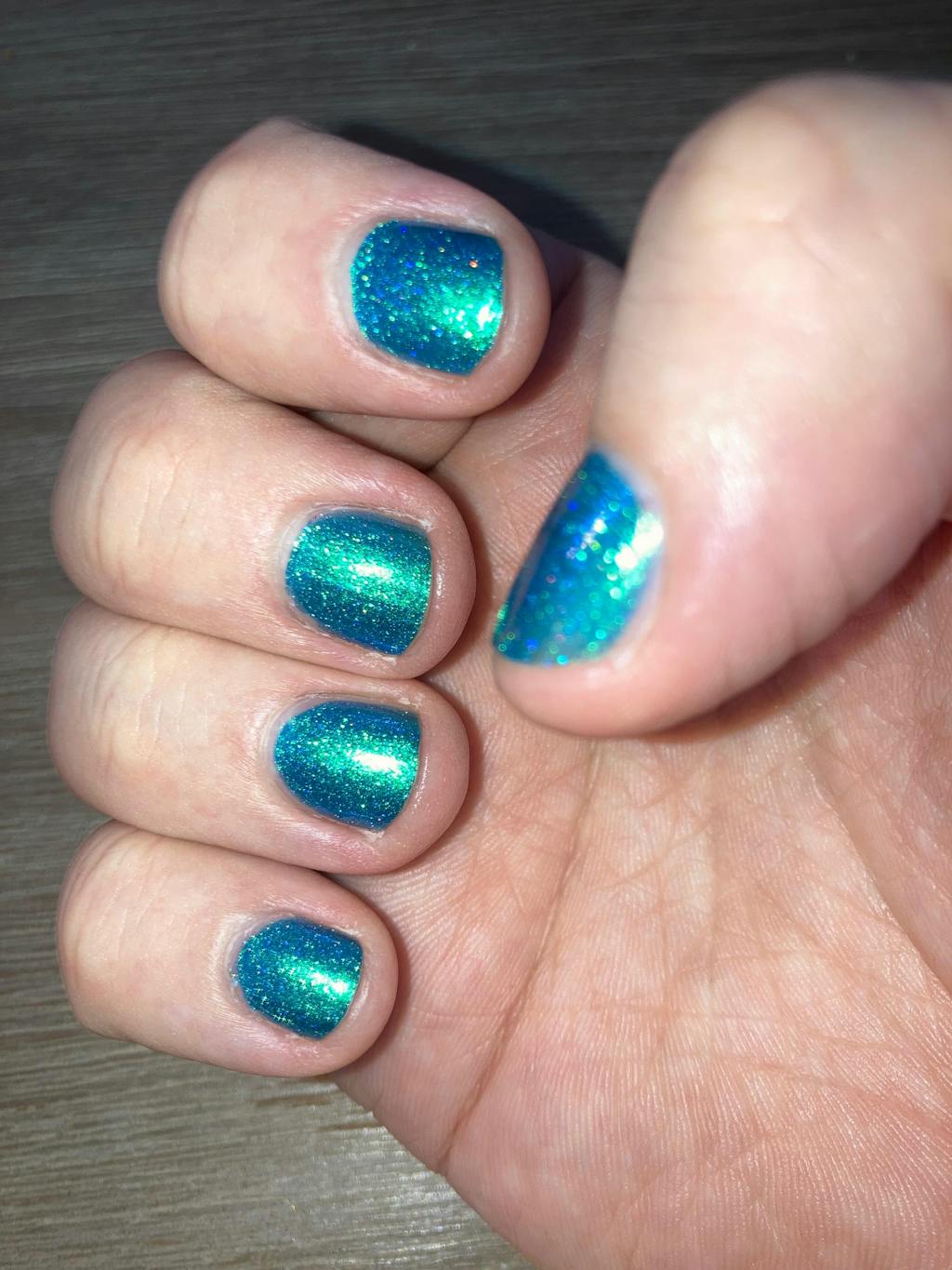 Radiant and otherworldly, Borealis captures the glow of the northern lights in motion. An electric teal to blue scattered holo shimmer, with hints of purple on an angle, it catches the light with a soft, celestial sparkle reminiscent of auroras dancing overhead.