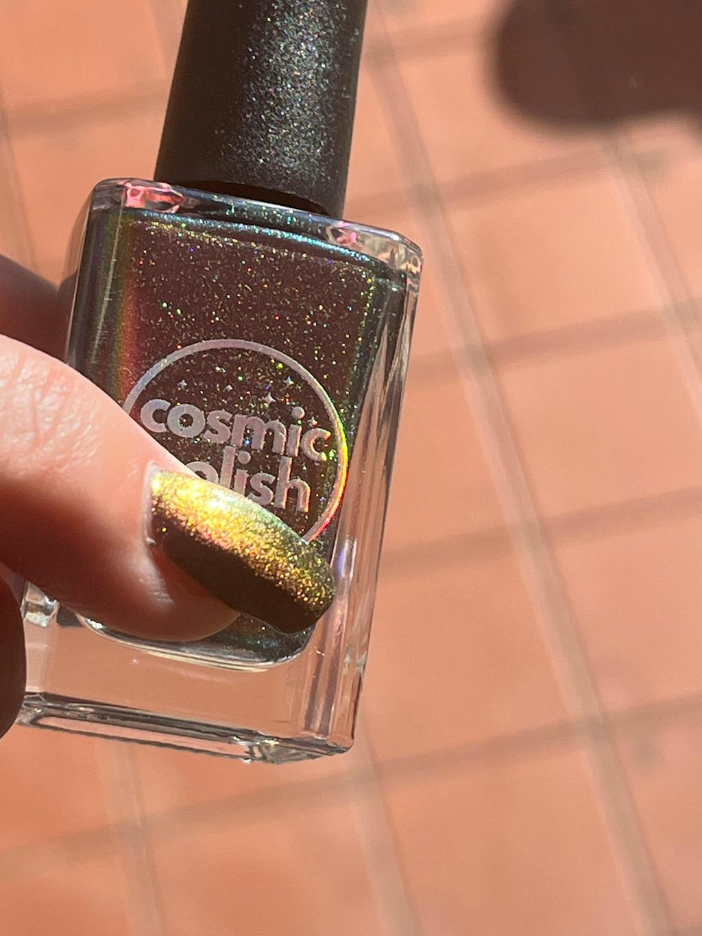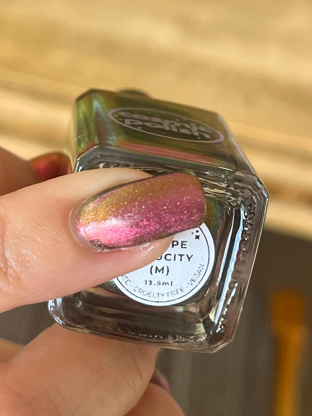 Launch at a dizzying rate with this polish! Escape Velocity is a black-based magnetic polish with a pink to gold shifting stripe and scattered holo. Become a gorgeous bright streak of colour and light at this speed - gravity is no match for your nails! Opacity in 2-3 coats.   Shown in swatch photos in cat-eye, velvet and unmagnetised.