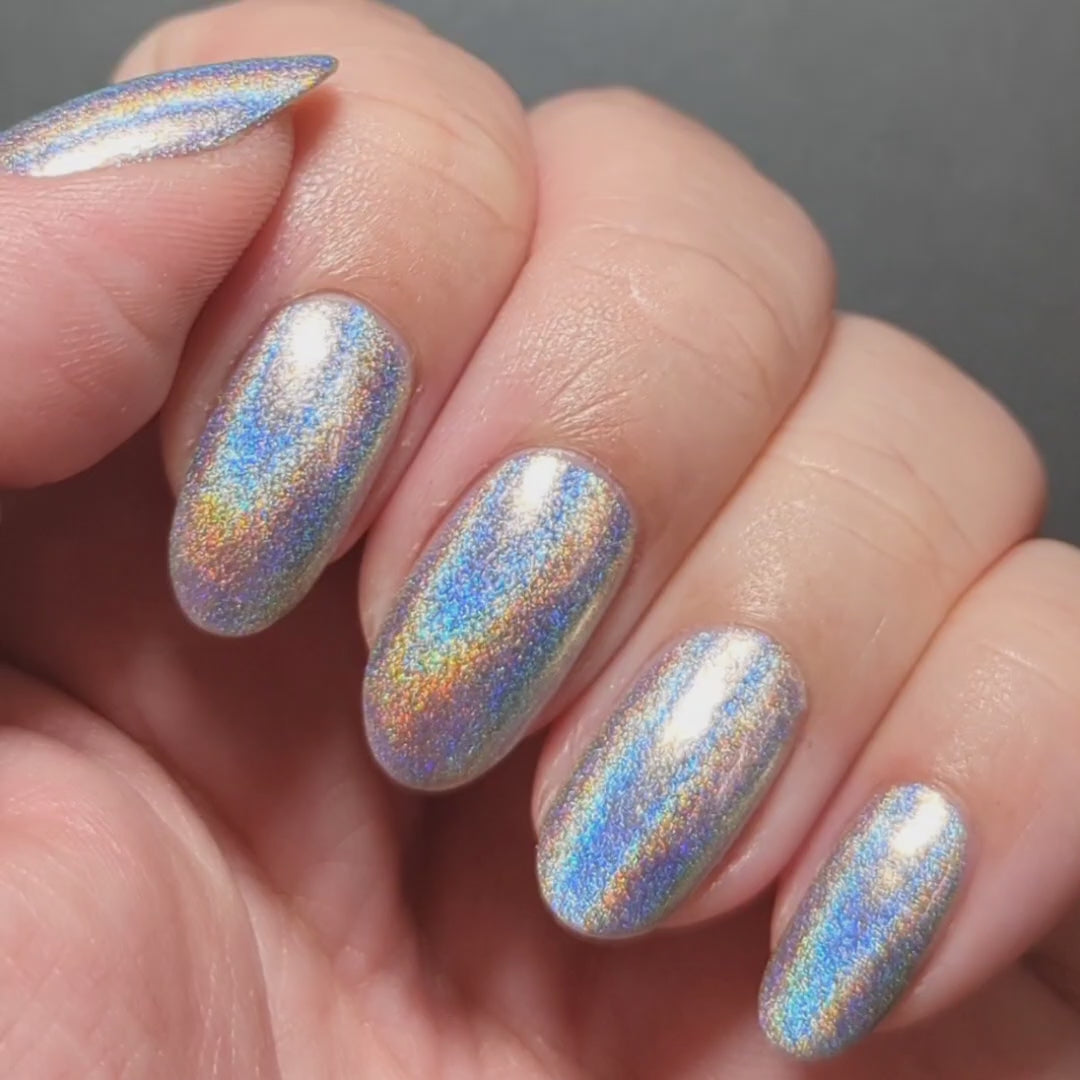 Float into pure holo wonder with Holo Flare, a silver linear holographic polish. There’s no need for a flashlight - this polish will light up any room.  2-3 coats for full opacity.