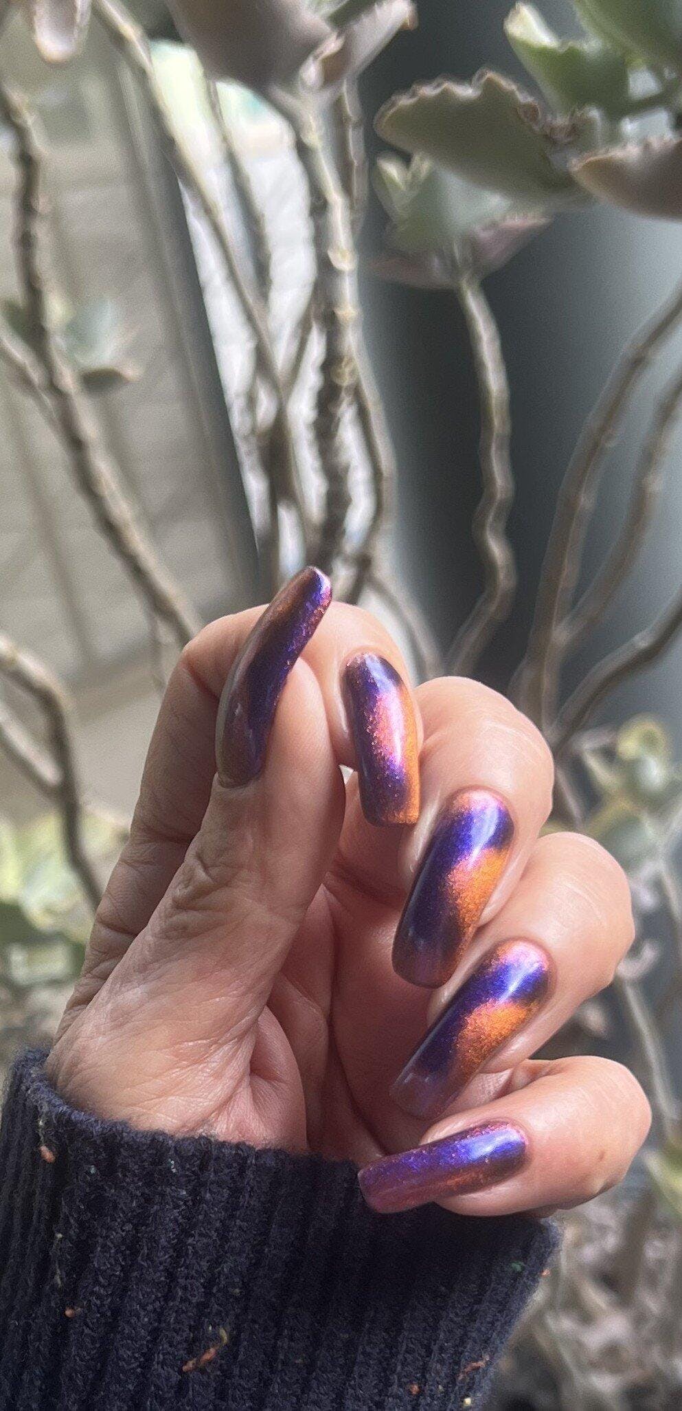 Shimmering like a galaxy just out of reach, Light Years Away pulls you into its orbit with a single look. You'll find yourself mesmerised by the deep purple base with glowing blue shimmer, with a warm golden magnetic line that cuts across like a star shooting through space. Opaque in 2 to 3 coats.