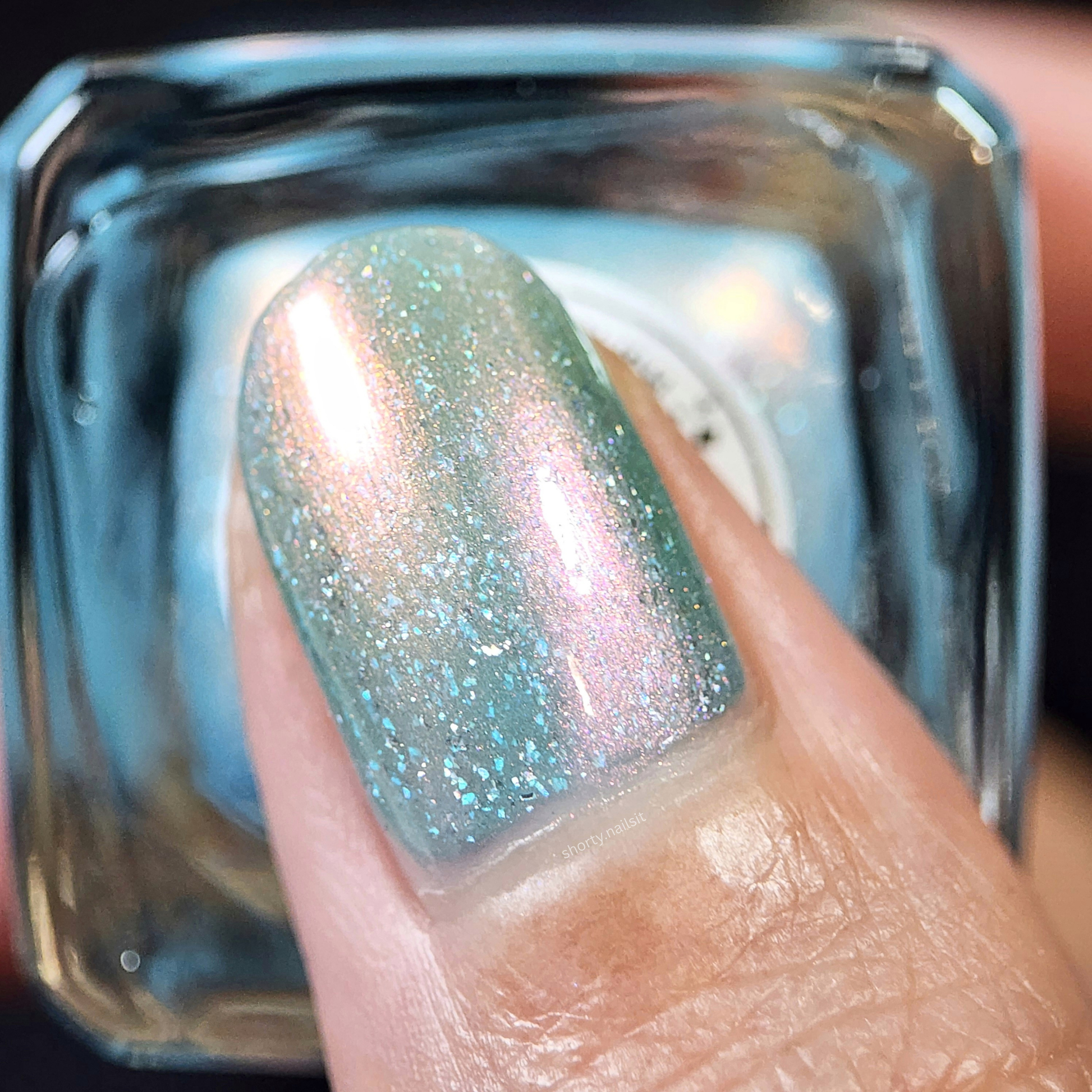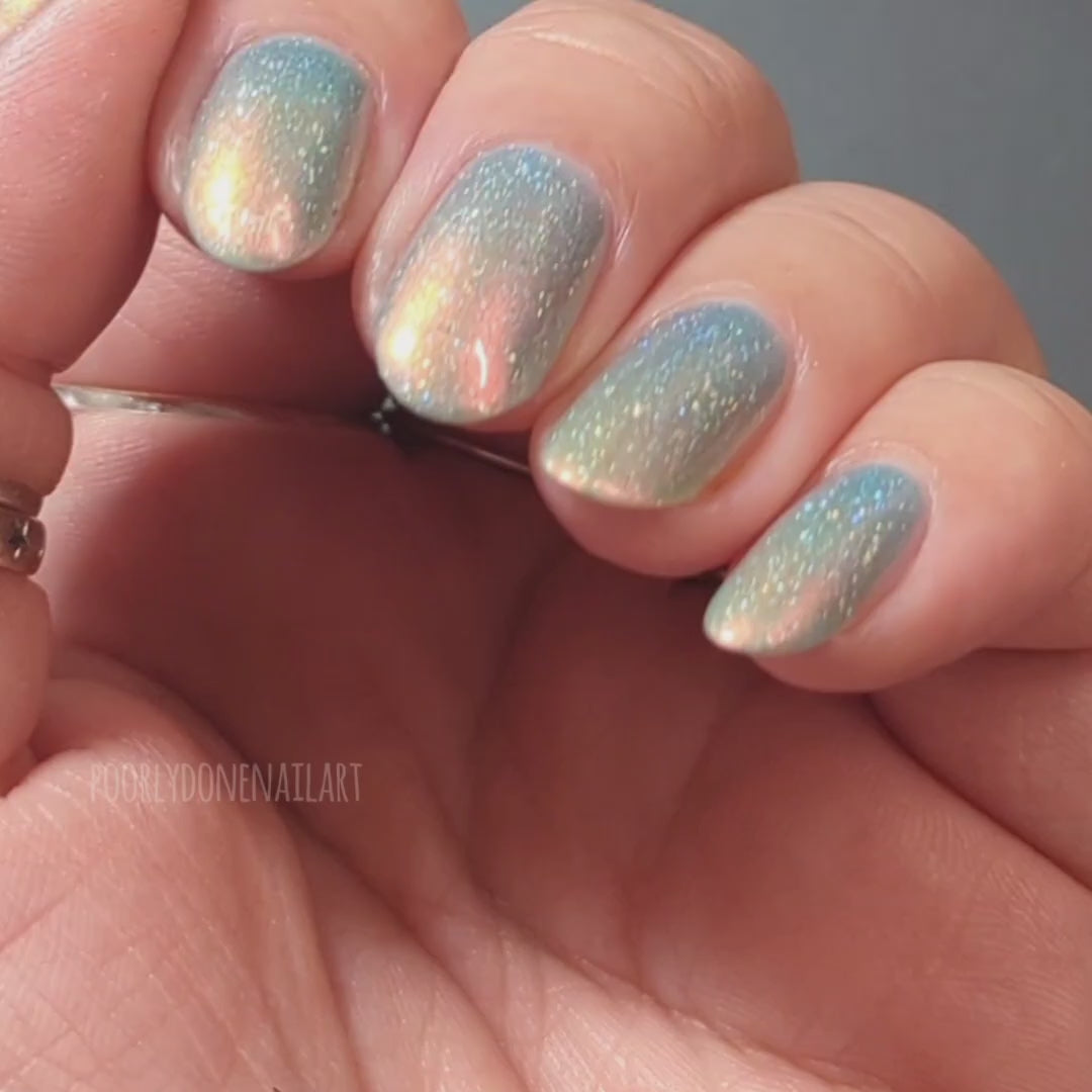 Lunar Echoes is a polish with a pale blue-green base and a strong pink to orange-gold shimmer, and silver holo flakes suspended throughout for a subtle sparkle.