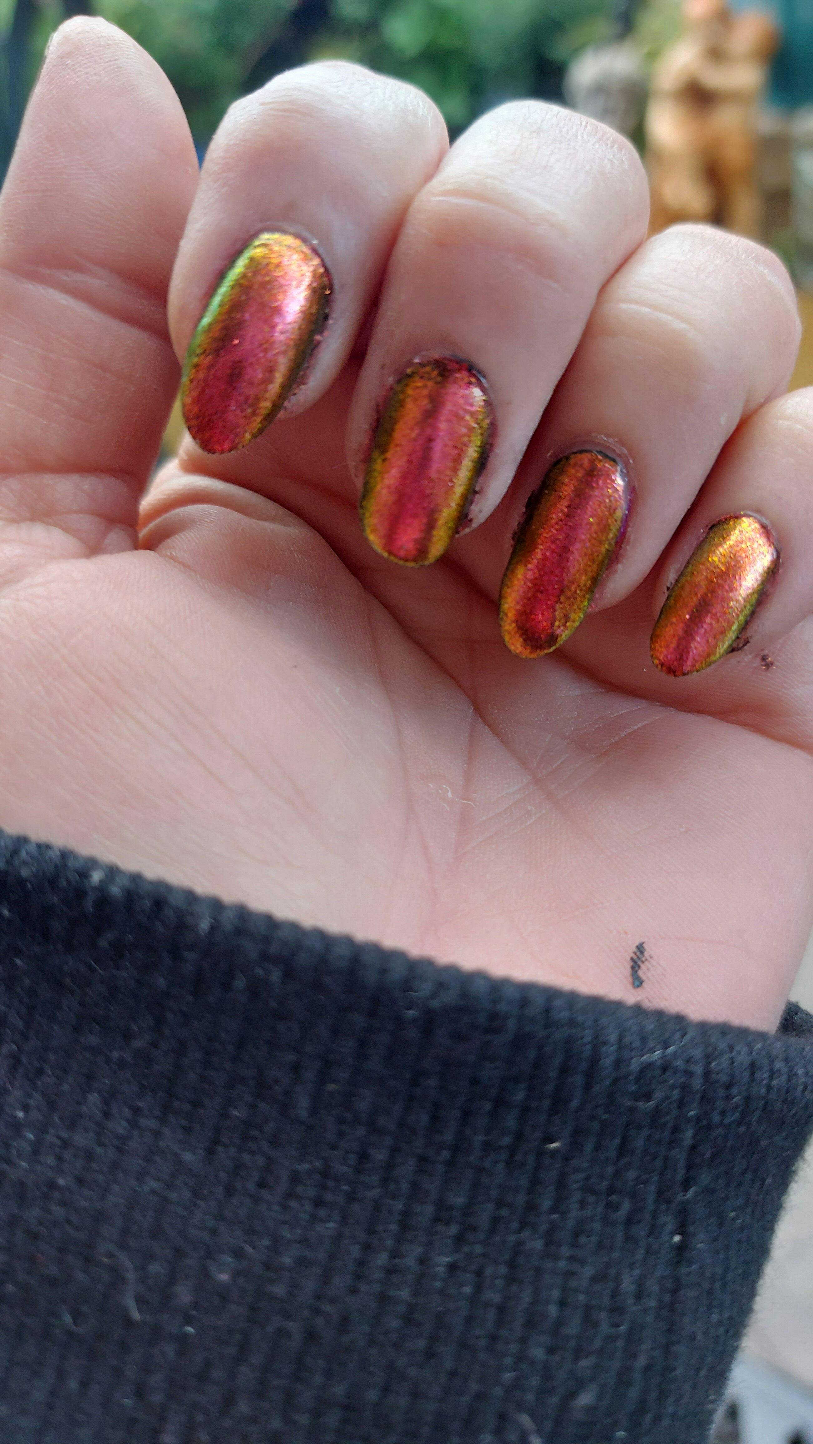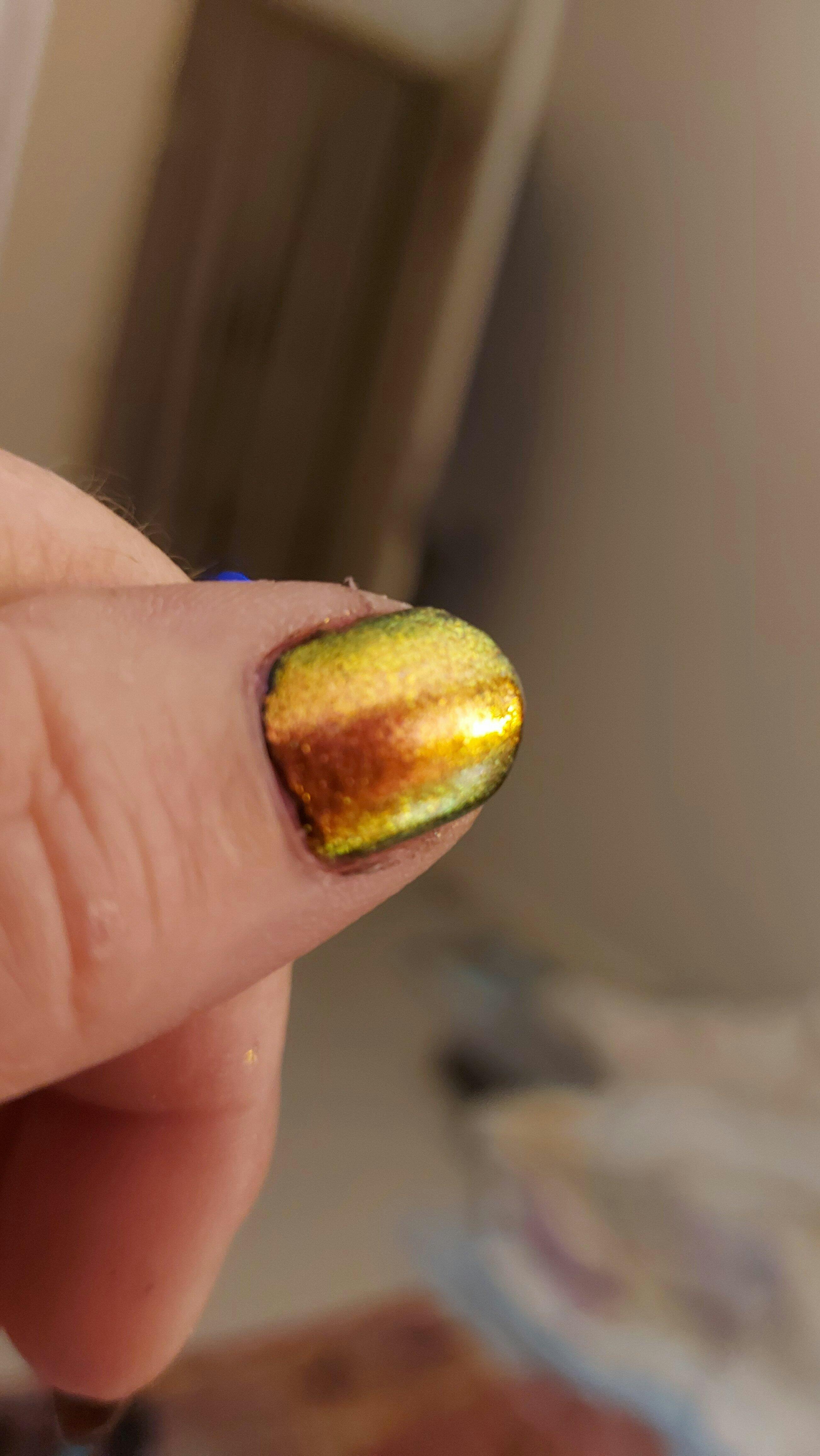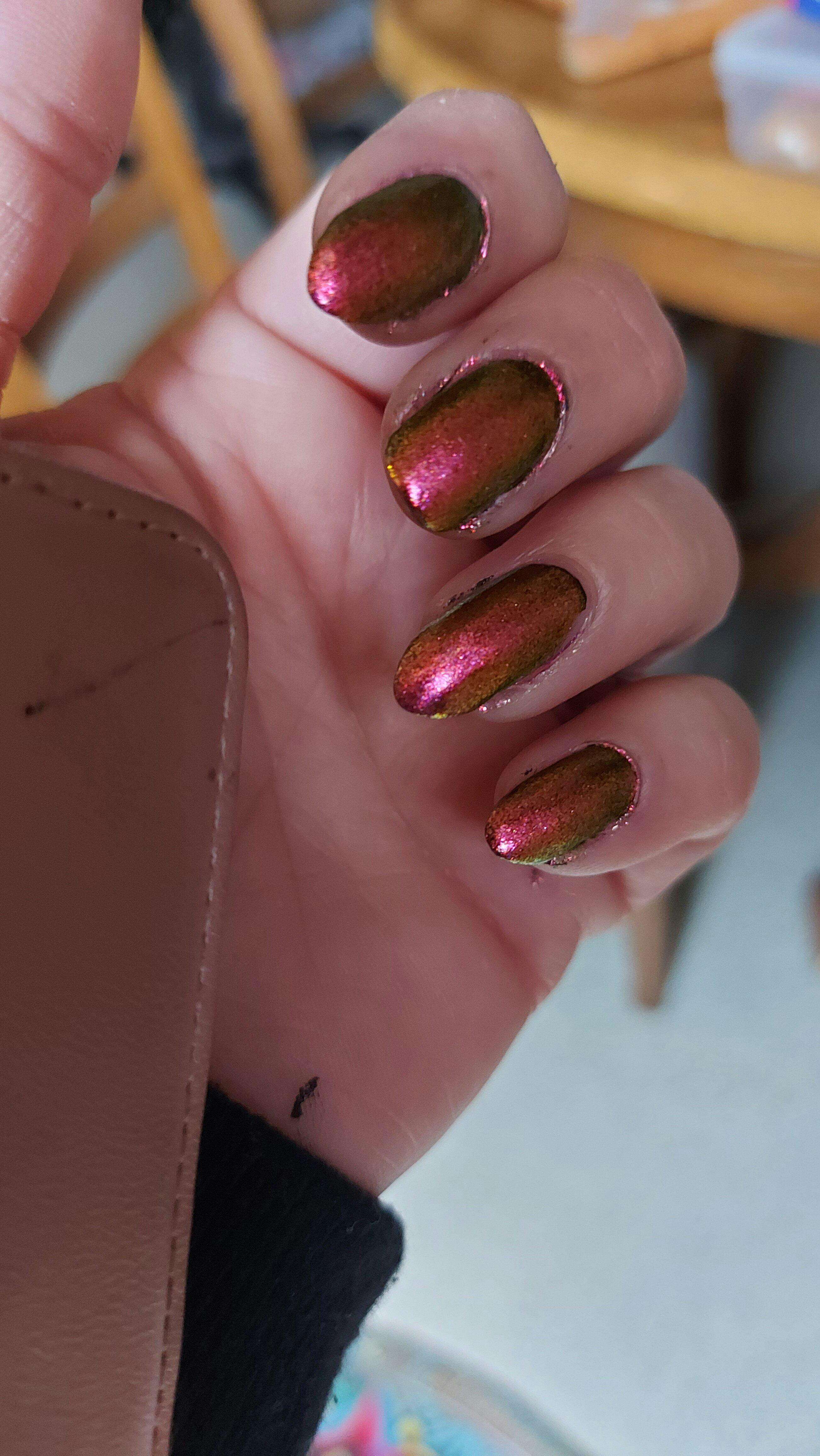 Photos cannot do this colour justice!! It is so pretty and multidimensional, purple, orange, green, blue shimmer shift. Very witchy/majestic/royal vibes