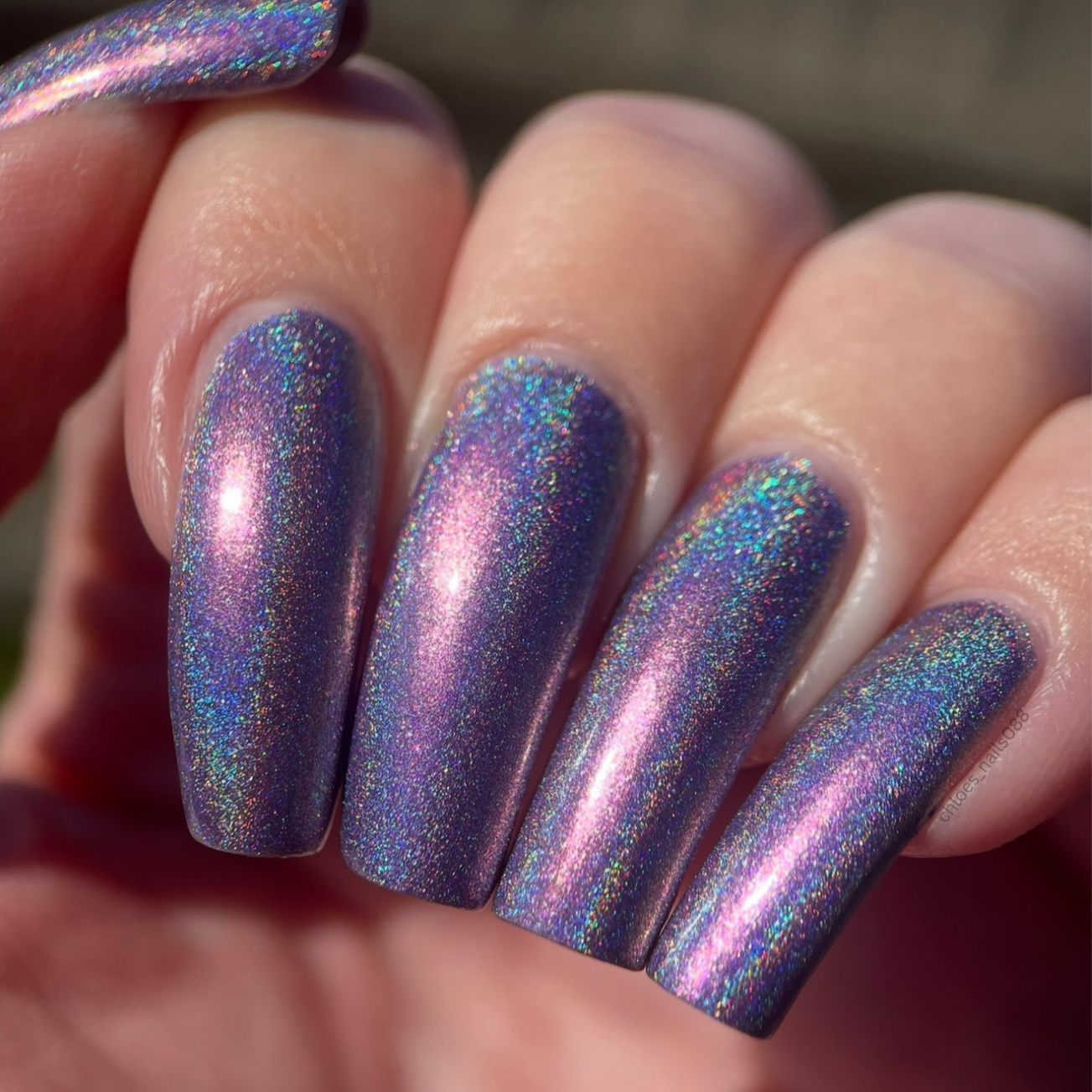 As the day fades into night, Twilight Shadows spring to life. This lavender linear holo carries a dusky pink shimmer that glows with warm golden tones - the last colours clinging to the horizon. Opaque in 2 to 3 coats.