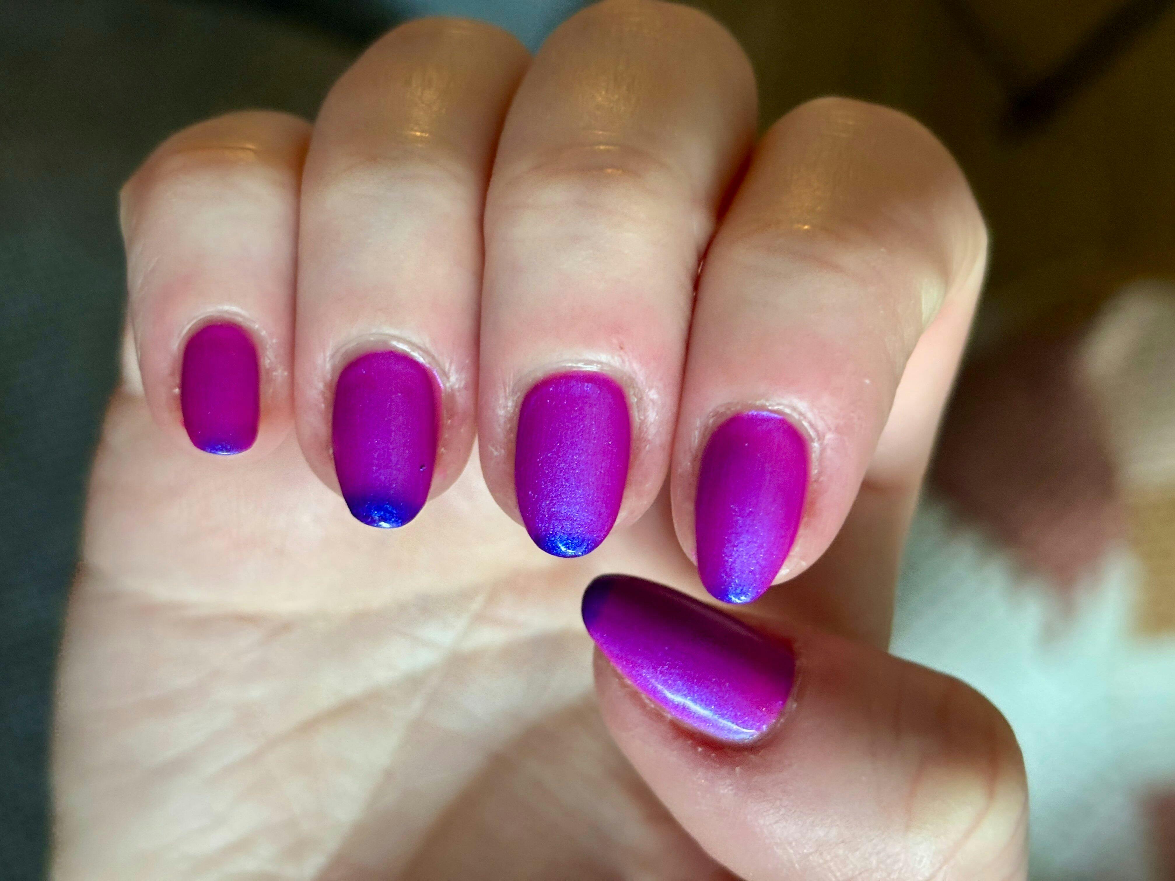 Lovely to apply and super reactive thermal. Goes from a deep, bright blurple to an orchid pink, with a strong blue shimmer throughout. Hilarious way to track hot flashes over the course of a day! 😅